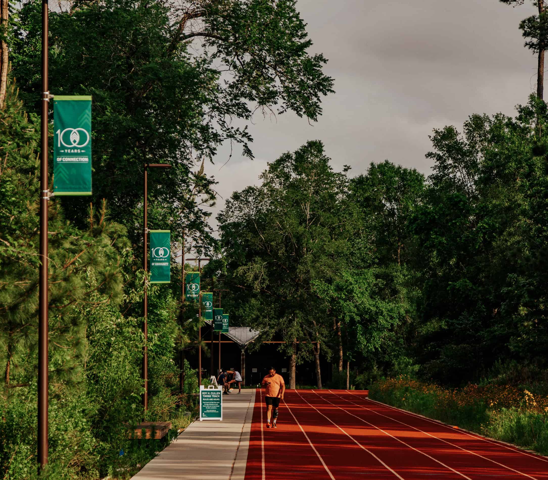 In 2023, the Running Complex opens on the south side of Memorial Park, including the 400-meter Roy H. Cullen Timing Track, viewing decks, an Event Plaza, and a café. The Park’s running community is elated.