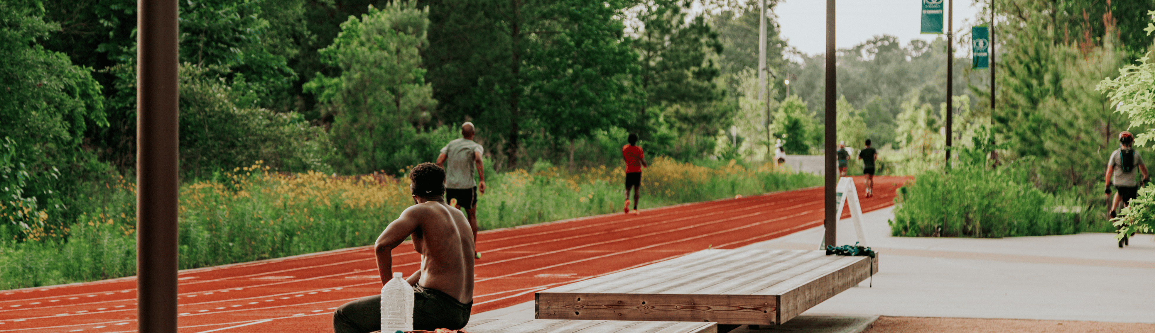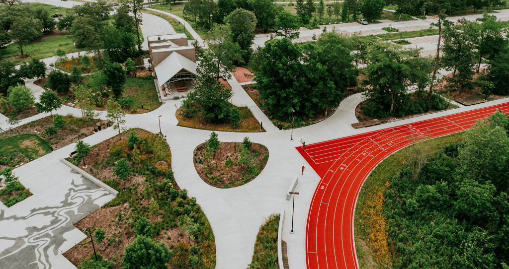 With a range of amenities such as the 400-meter Roy H. Cullen Timing Track, viewing decks, an Event Plaza and Terrace, gathering areas, trails, and more, the Running Complex is thoughtfully designed to be a central meeting place for all Park visitors while also providing an entrance to explore the Bayou Wilds trails of Memorial Park.