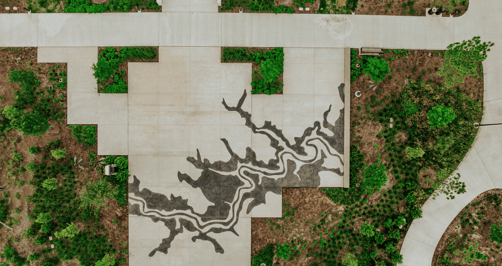 The Event Plaza & Terrace is a new jewel box event space located behind the Cullen Running Trails Center. Beautiful, salted concrete features an etching of Buffalo Bayou, which forms Memorial Park’s south border.