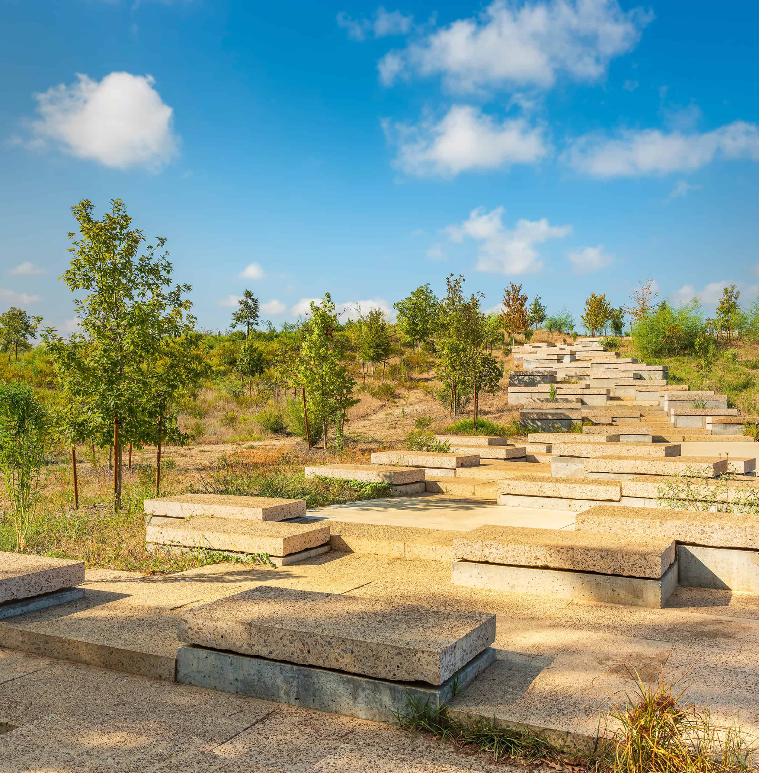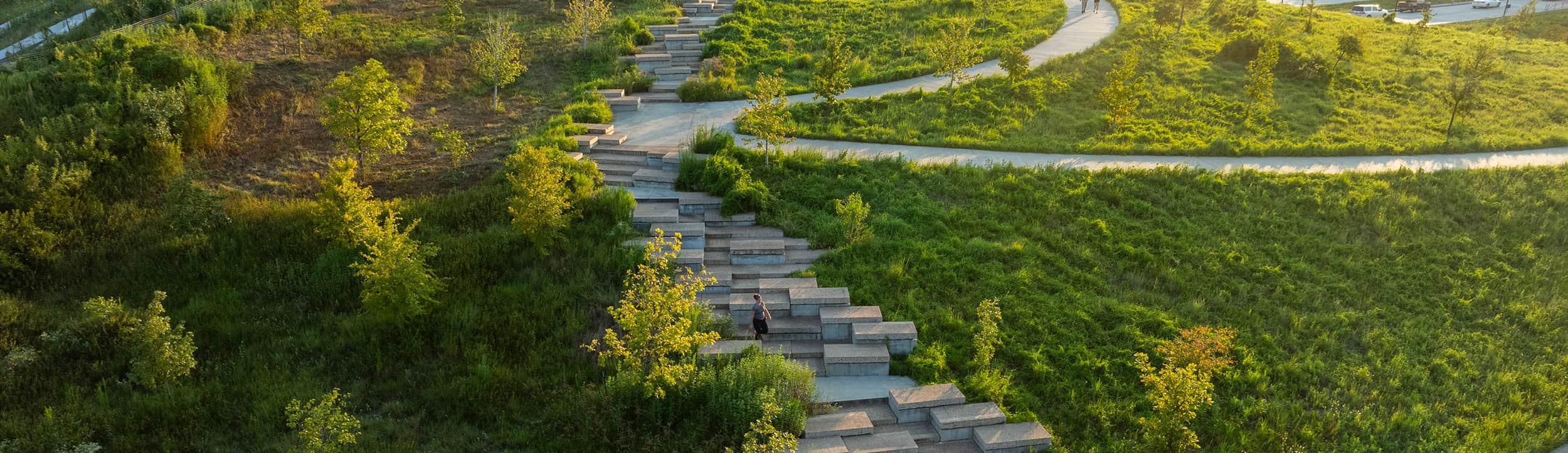Located on the East Mound of Kinder Land Bridge and accessed from the Seymour Lieberman Trail, the Emily Clay Family Scramble forms an impressive stairway leading to an expansive lawn above Memorial Drive.