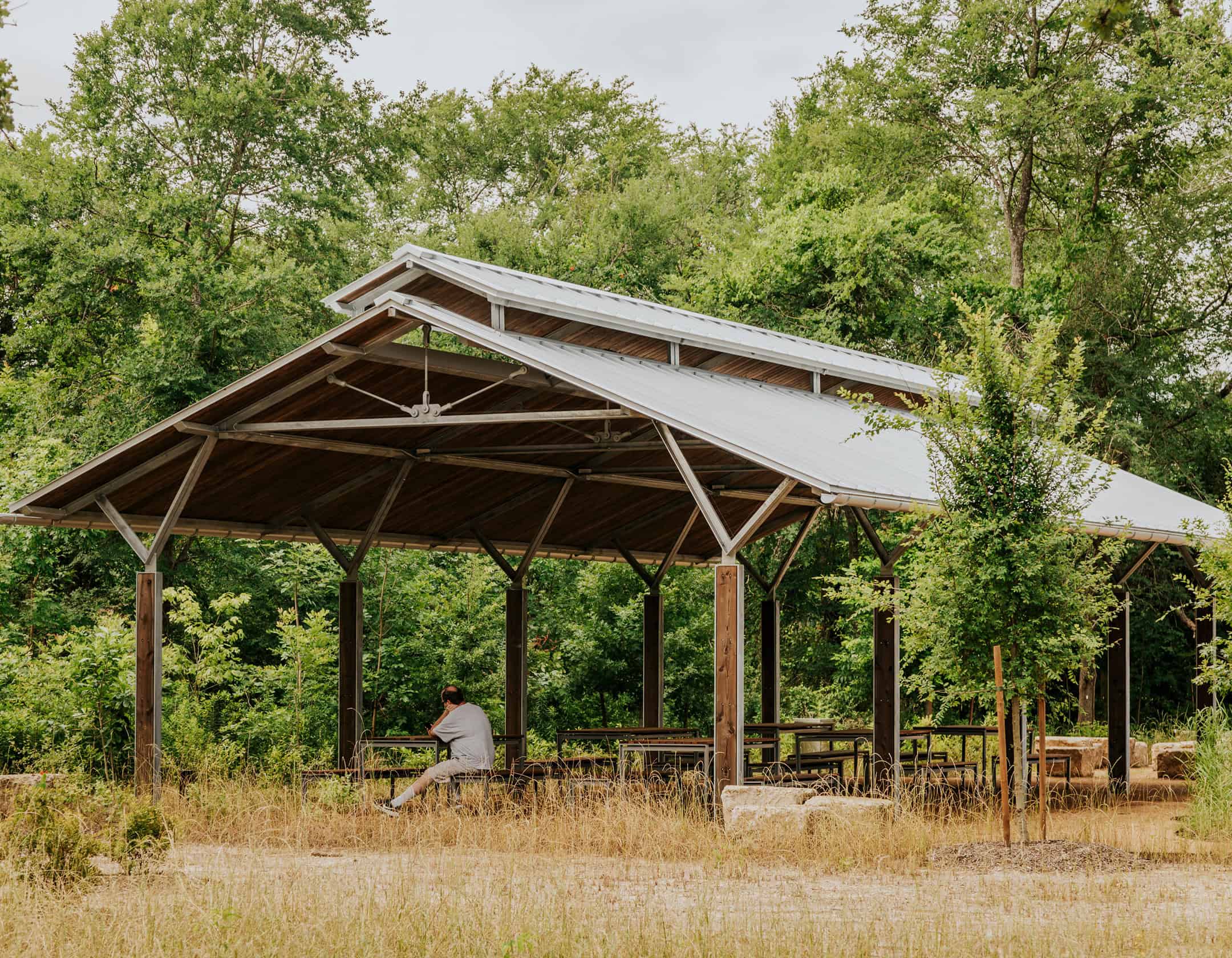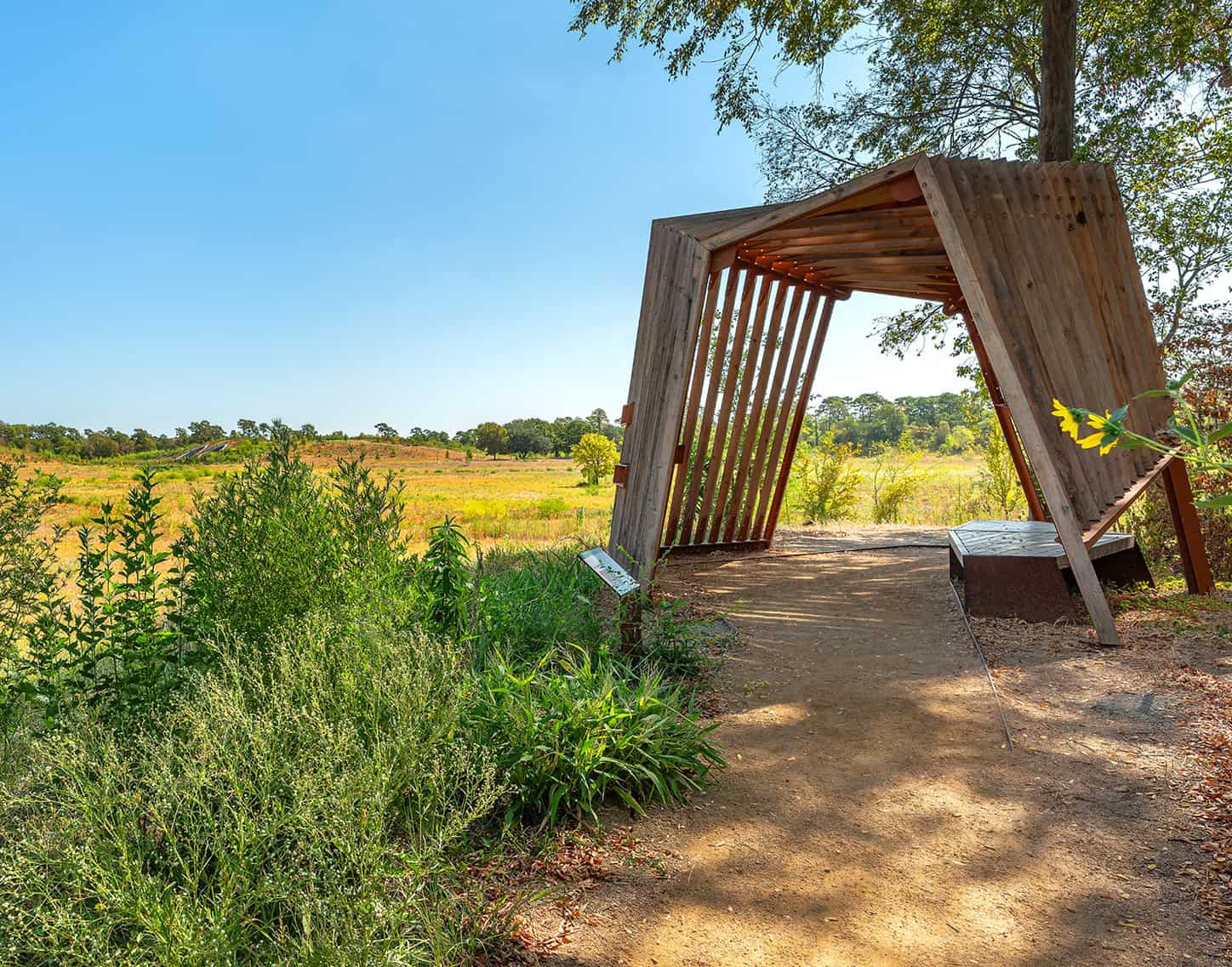 The Overlook Pavilion provides a distinctive viewpoint of Cyvia & Melvyn Wolff Prairie, allowing you to immerse yourself in the native flora and fauna that inhabit this section of Memorial Park. During sunset, animals frequently congregate in the wet prairie surrounding the pavilion, offering a unique sight amidst the urban landscape.