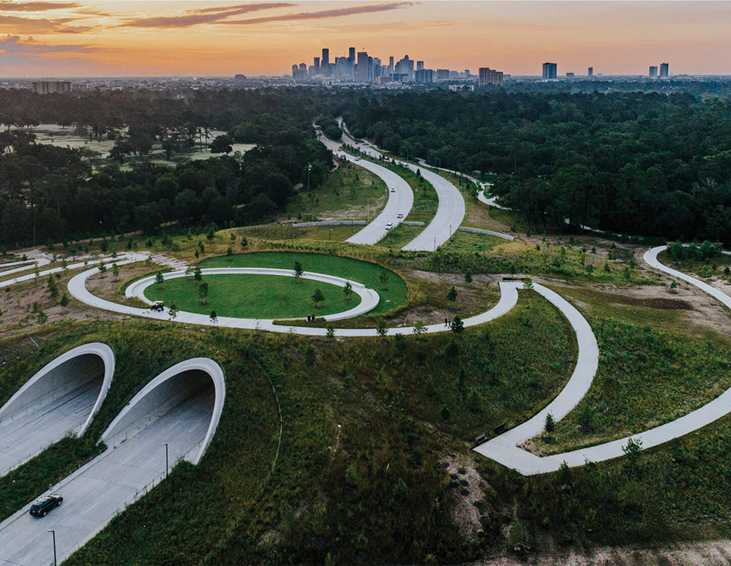 Greater safety and connectivity: Swaths of greenspace on top of the Bridge provide places to relax and enjoy new vistas of the Park and the city beyond, and also serve as a hub for socializing and events. This “new” parkland is an innovative approach to green infrastructure, healing the divide cut by Memorial Drive through the middle of this treasured urban wilderness park half a century ago. Views from the crests of the Land Bridge highlight the Park’s unique vantage point as an oasis of greenspace nestled between the urban skylines of downtown to the east and Uptown to the west.