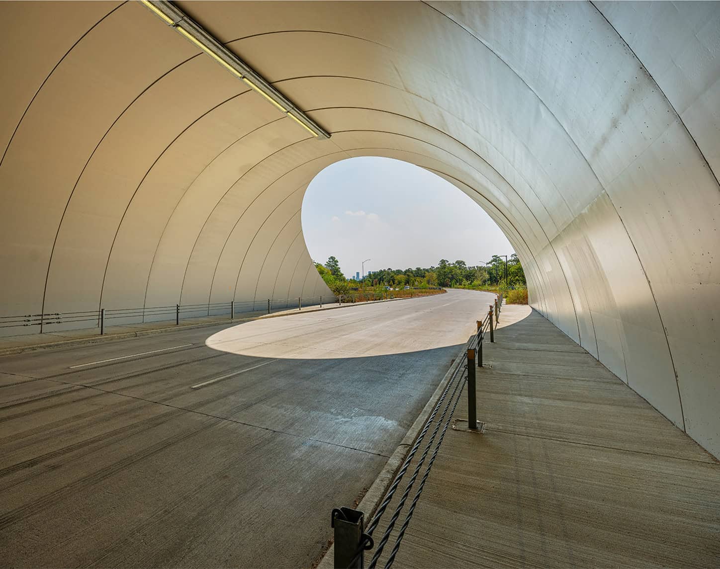 One of the most important aspects of Kinder Land Bridge are the tunnels that run through the mounds. Each tunnel is lit by natural light in the day as well as an overhead lighting strip that runs the length of each tunnel. These lights remain on 24-hours a day and respond to the natural light conditions to maintain an optimal field of vision.