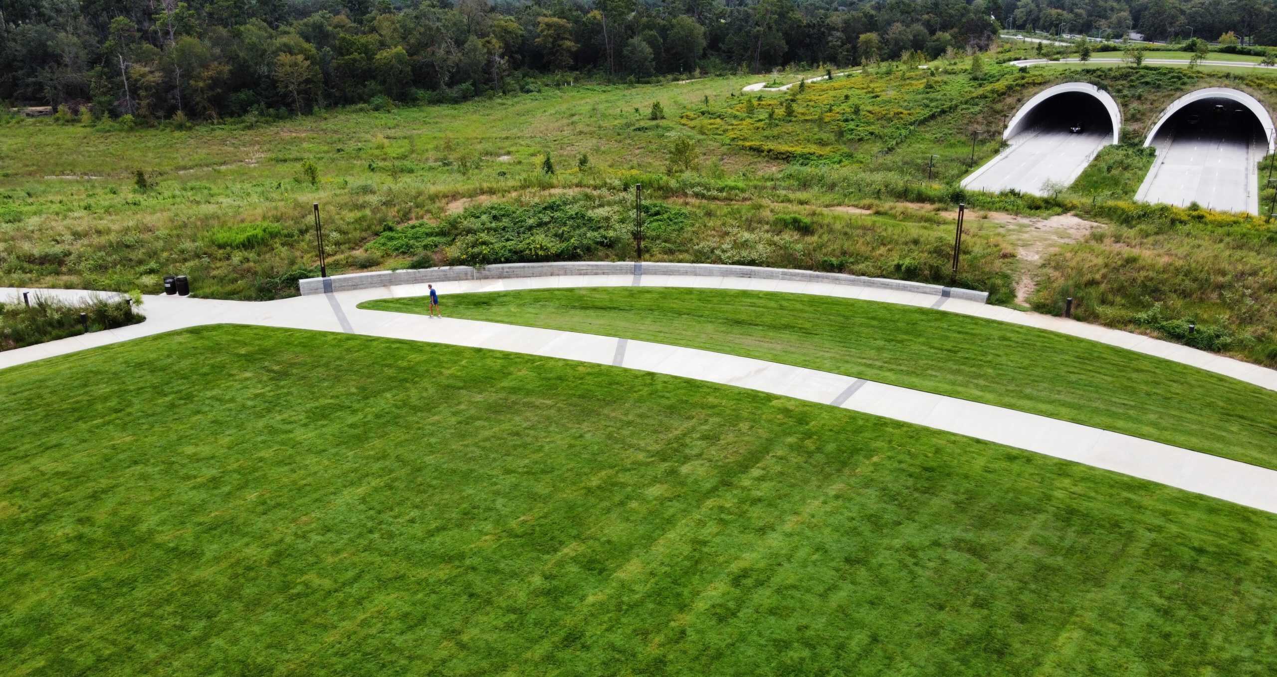 Visitors can access Kinder Land Bridge from entry points on both the north and south sides of the mounds. Lighted pathways guide users to the top of each greenspace and down the other side.