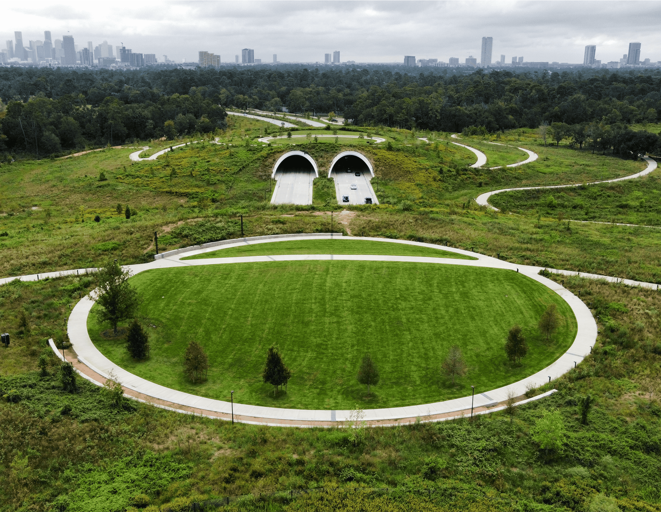 Two massive tunnels—measuring 400 and 560 feet long—have been built side by side over the Memorial Drive roadway. On top of the 35-foot-tall Land Bridge, you’ll find two unique greenspaces that each offer a serene setting with unmatched views of Houston’s Uptown and Downtown skylines and Cyvia & Melvyn Wolff Prairie.