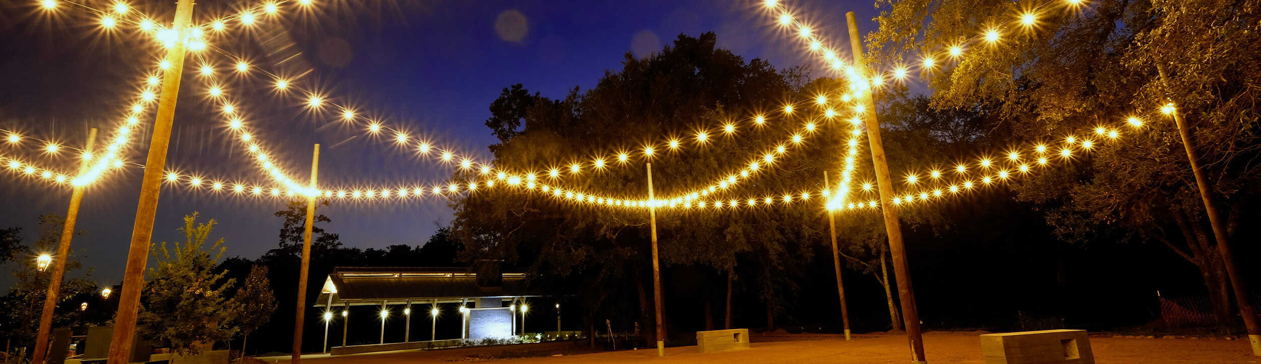 Picnic tables sit in the shade of the tree canopies and twinkle lights create a festive atmosphere in the evenings.