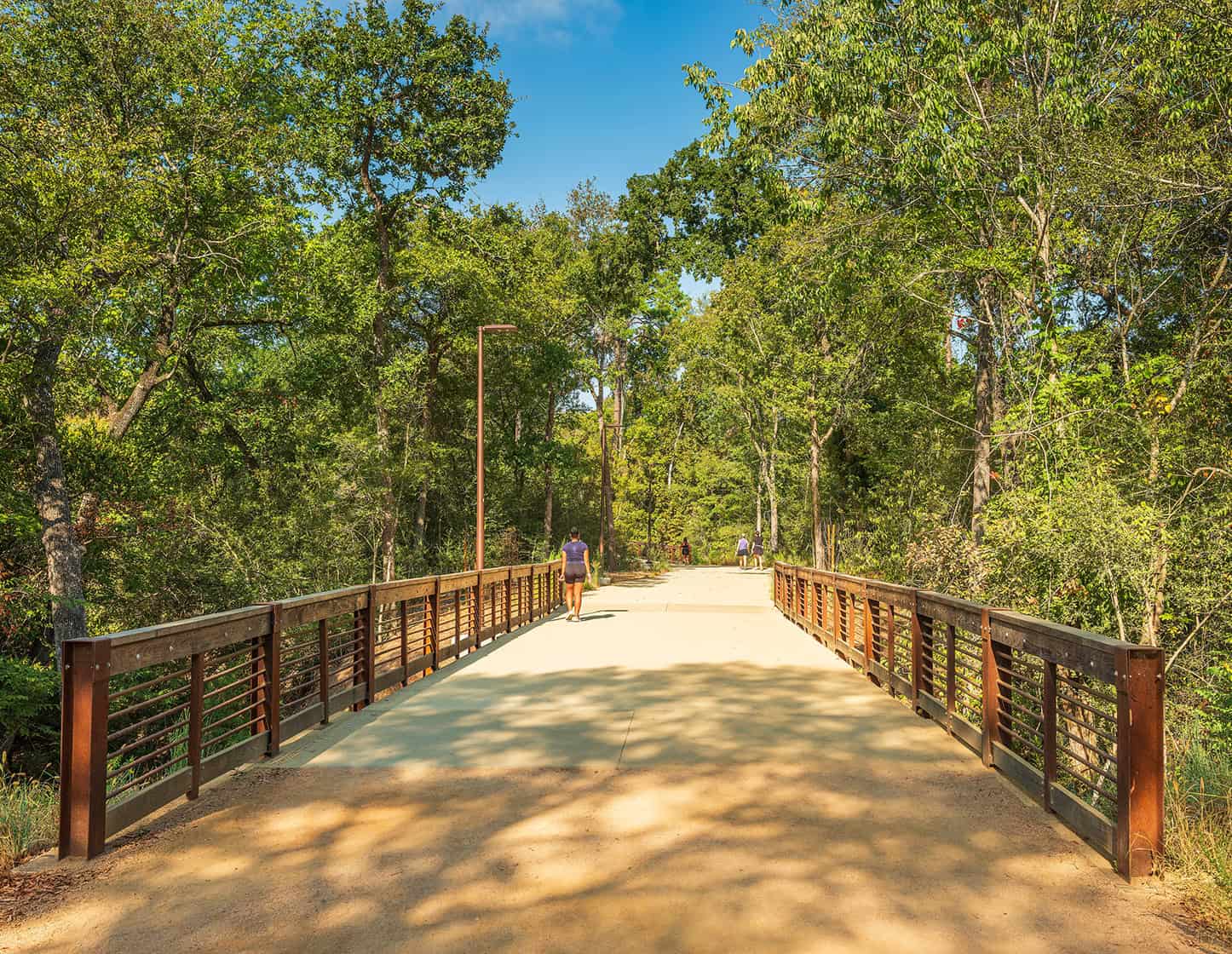 This section brings Park users through some of the most scenic and shaded areas of the 3-mile-loop. These bridges are situated above three ravines that connect to Buffalo Bayou. This area, situated amongst the trees, offers views of the Park’s native riparian landscape, further knitting together Houston’s unique and multifaceted terrain with the activities of Park users so everyone is able to enjoy Houston’s urban wilderness.