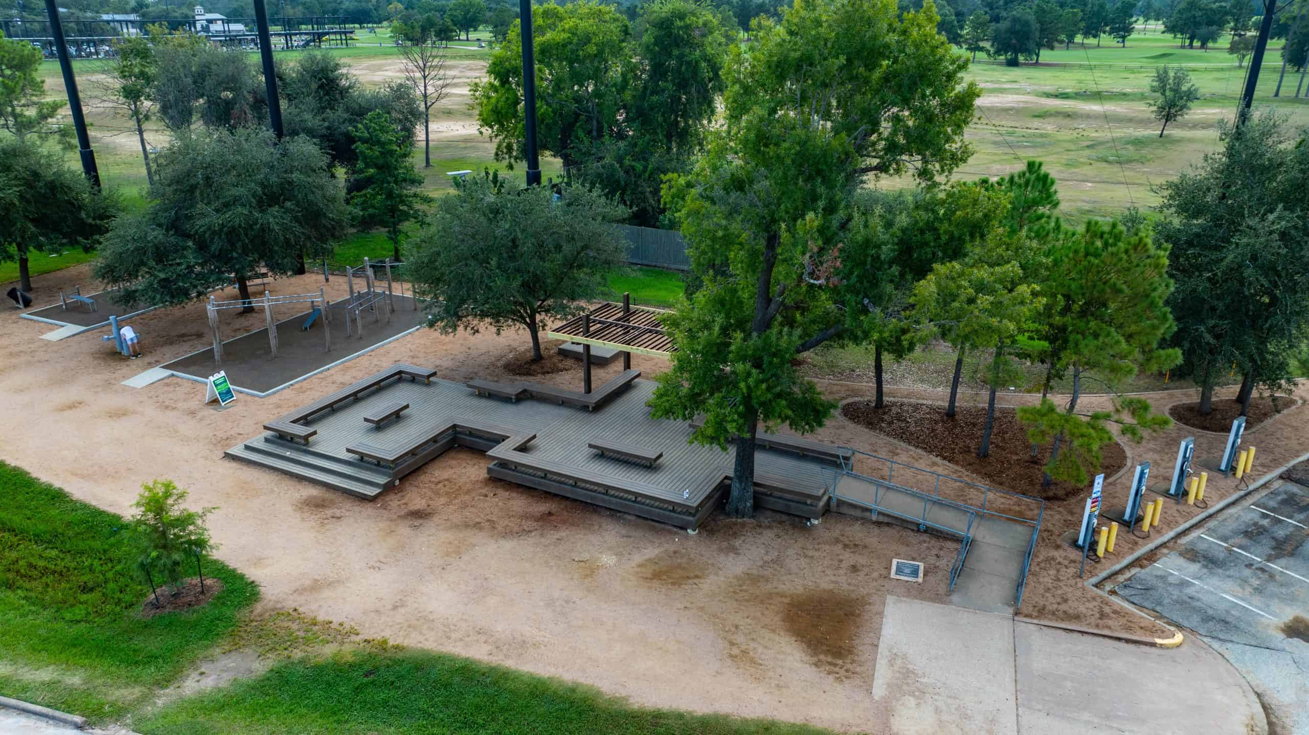 Located near the Tennis Center along the popular Seymour Lieberman Trail, the newly renovated Stretching Deck offers a welcoming space to meet with friends or warm up for a workout. The area now features a durable, upgraded deck, modern fitness equipment with a safety fall surface, and a shaded pergola for added comfort. Enjoy the convenience of multiple water fountains and an outdoor shower for a quick rinse. As part of Memorial Park’s commitment to sustainability, the space is now illuminated with solar-powered lights—making it a functional and inviting stop for park visitors any time of day.