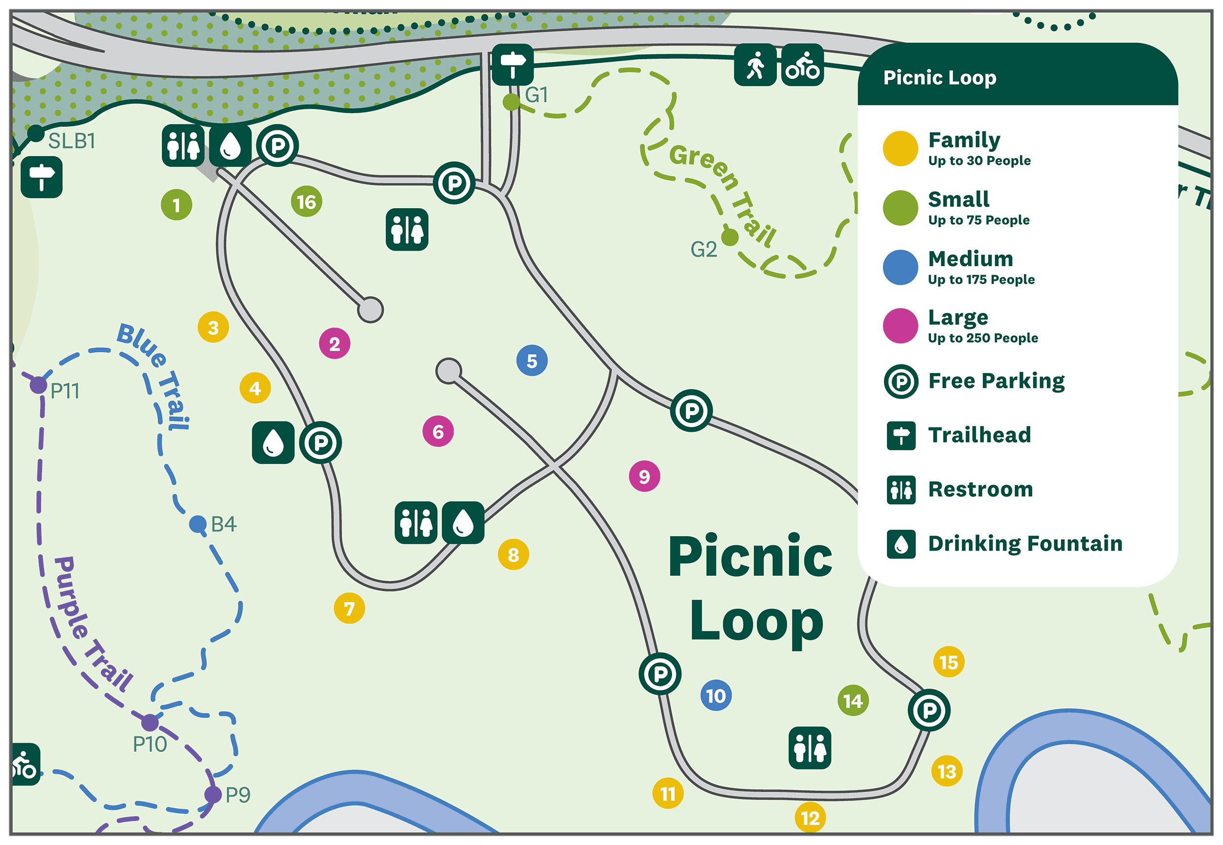 • Small Picnic Areas 1, 14, & 16 (marked in green) can be reserved for up to 75 people