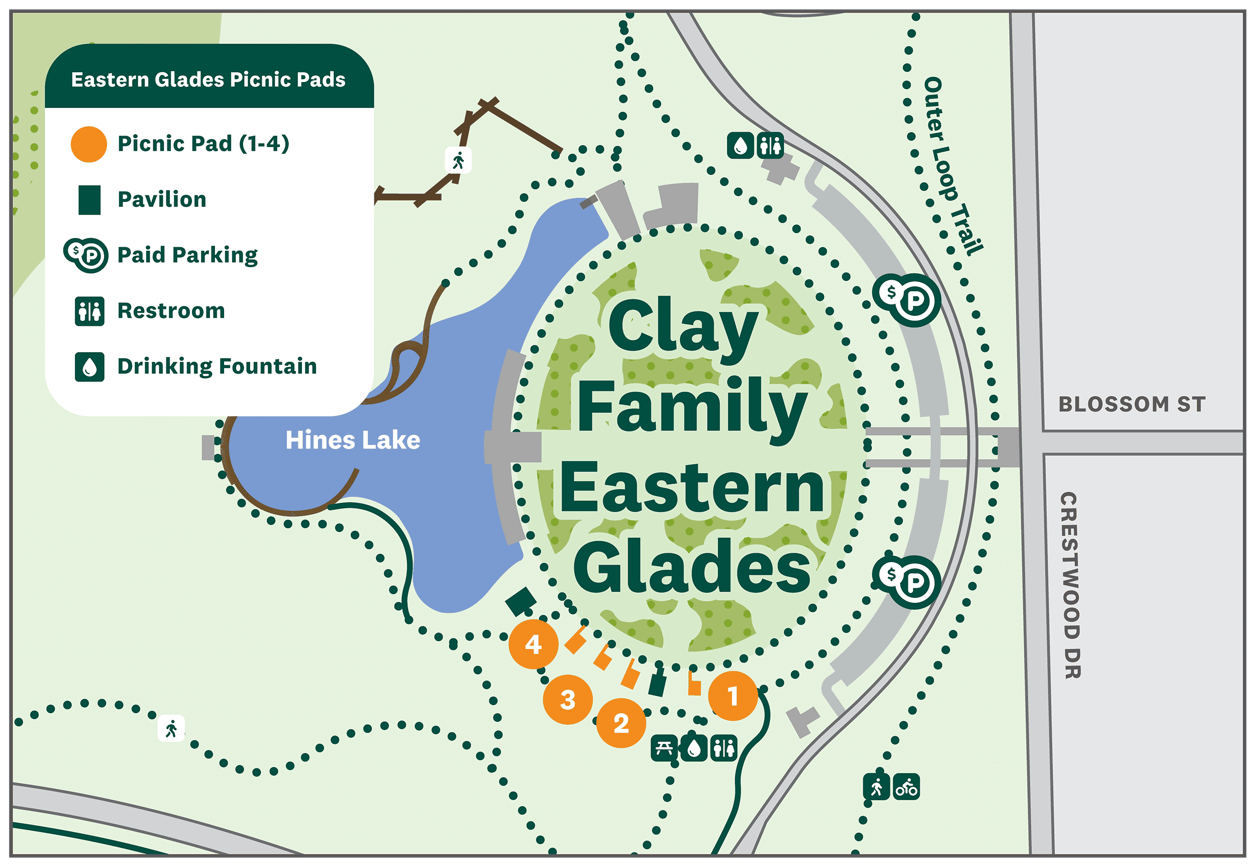 Located exclusively at Clay Family Eastern Glades, Memorial Park’s Picnic Pads are distinctively marked gravel areas. Each of these open spaces offers access to a charcoal grill and picnic tables for your enjoyment. All picnic pads include access to restrooms. If not already booked, these spaces are free to use on a first-come, first-served basis.