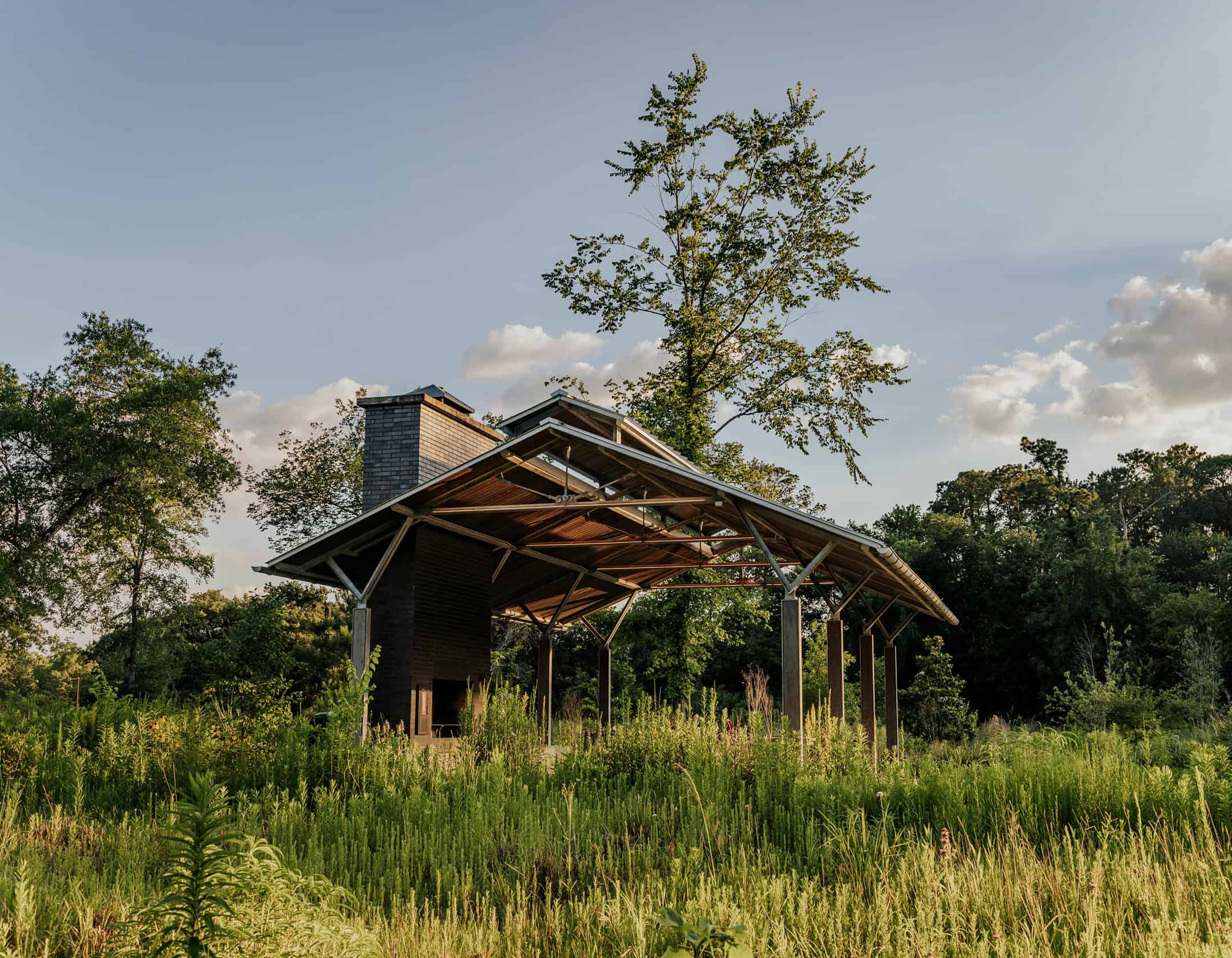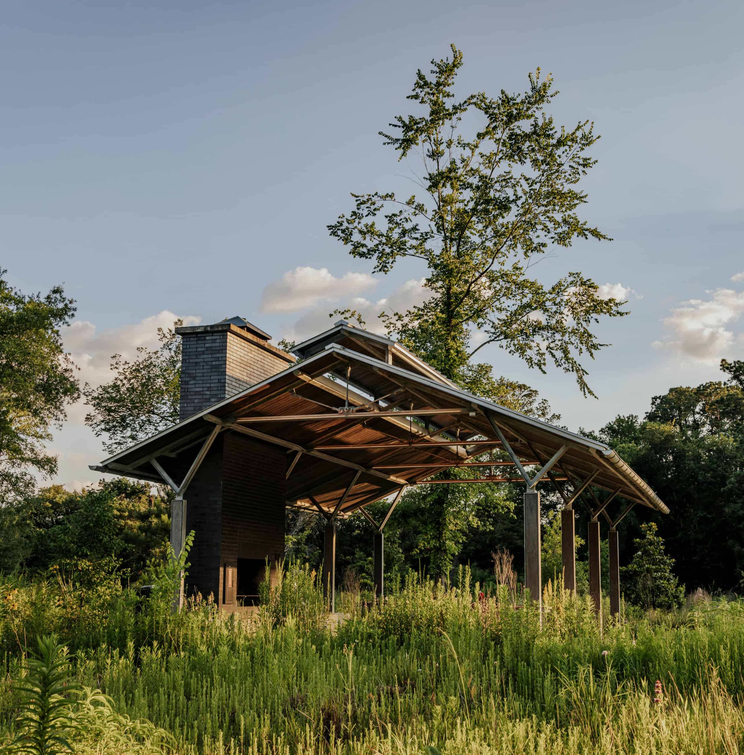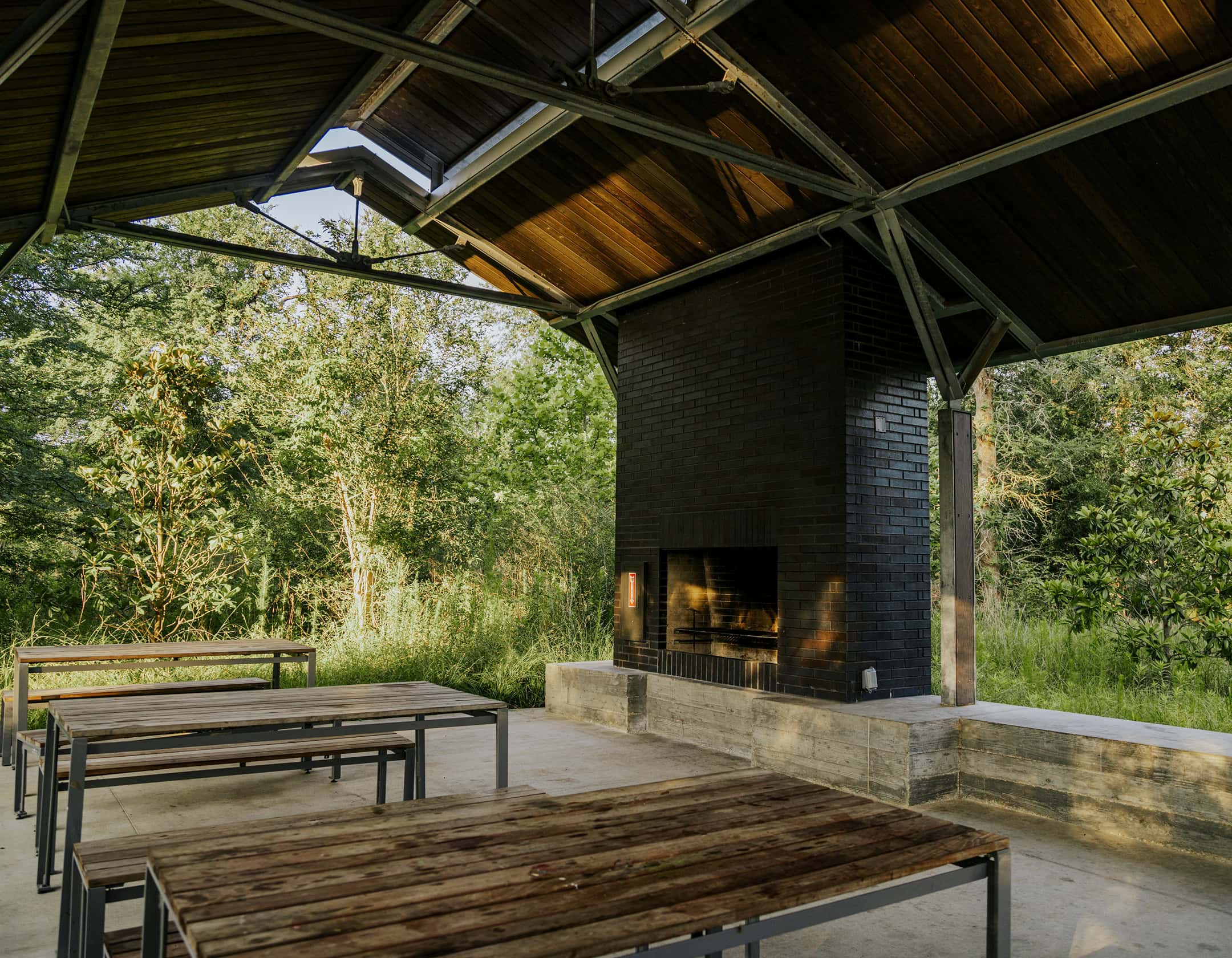 The Promenade Pavilion, located on the southern portion of the Oval Trail, is nestled between four Eastern Glades Picnic Pads. The Promenade Pavilion includes a fireplace with a built-in grill for food preparation and electrical access. At this time, four picnic tables are available for use. Guests may bring their own tables and chairs.